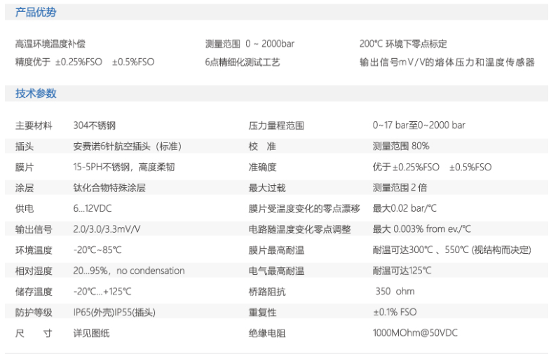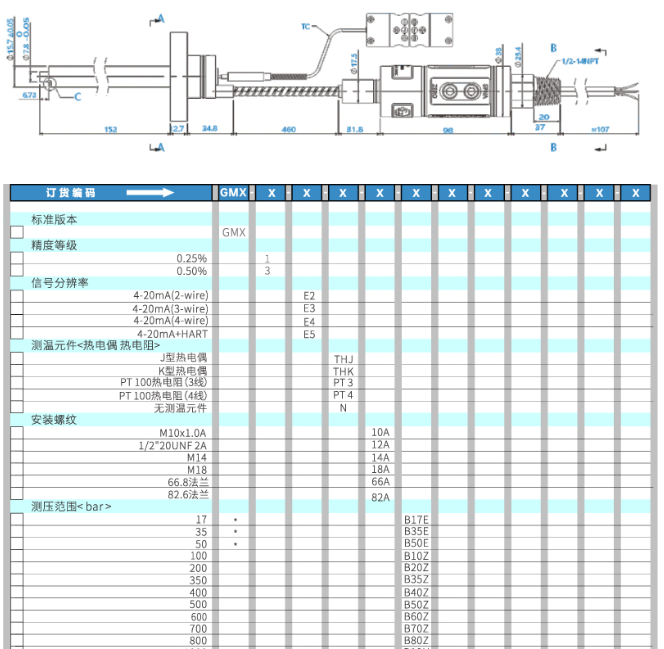 I7n廣州南創電子科技有限公司Graeff 綠色填充DTA系列的高溫熔體壓力傳感器的特點是使用壽命長、的材料、的測量性能和食品級的傳輸介質。我們的傳感器完全由不銹鋼制成,一種特殊材質的膜片,并使用鈦及其他金屬合成的涂層保護膜片不受黏度和摩擦性較大物質的影響。傳感器使用的其他材料通過高強度的測試并由特殊工藝制造。不像NaK或汞填充的介質,環保合金介質填充受溫度漂移的影響更小更穩定。因為使用了對環境無害的材料,所以我們的傳感器可以用于食品和制藥。所有熔體壓力傳感器不同的剛性桿長度和柔性管長度都可以根據現場工作環境在選型表中對應選擇。DTA版本已經包括了一個可更換的溫度傳感器,可選擇電偶或熱電阻作為測溫度元件。
