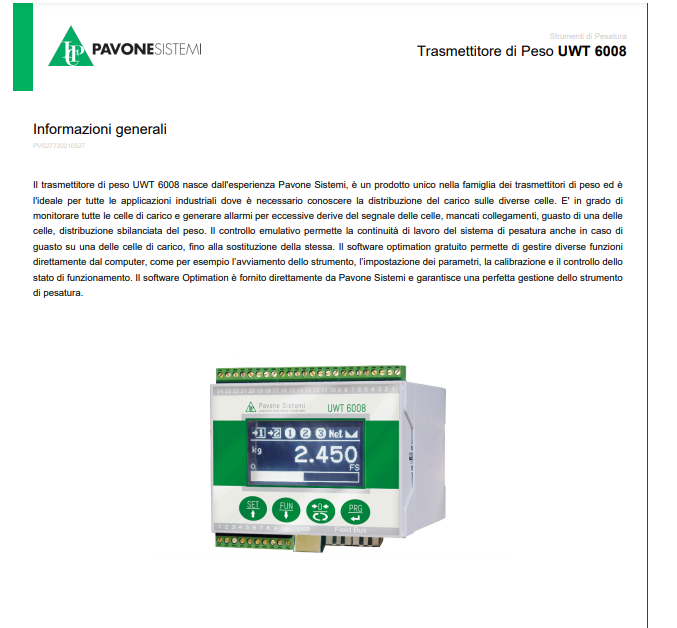 意大利pavone sistemi UWT 6008重量變送器是Pavone Sistemi重量變送器系列中的獨特產品,意大利Pavone Sistemi稱重變送器適合需要了解不同單元上的負載分布的所有工業應用。它能夠監控所有稱重傳感器與意大利帕瓦內壓力傳感器,并在傳感器信號漂移過大、無連接、其中一個傳感器故障、重量分布不平衡時發出警報。即使在其中一個稱重傳感器出現故障的情況下,仿真控制也允許稱重系統的工作連續性,直到它被更換。免費的優化軟件可讓您直接從計算機管理各種功能,如啟動儀器、設置參數、操作狀態的校準和控制。Optimation 軟件由 Pavone Sistemi 直接提供,保證稱量儀器的完美管理。1AG廣州南創電子科技有限公司