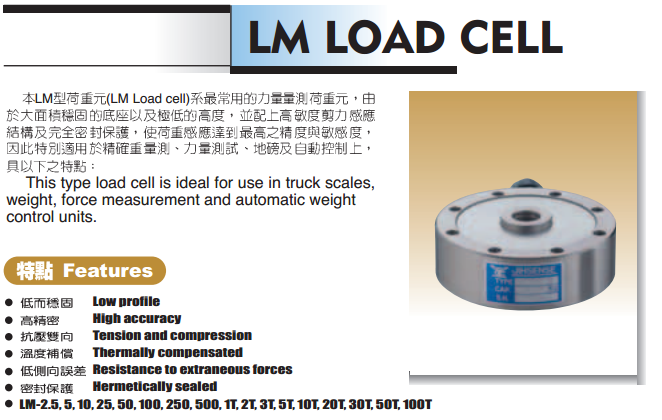 本LM型荷重元(LM Load cell)係最常用的力量量測荷重元,由於大面積穩(wěn)固的底座以及極低的高度,並配上高敏度剪力彈力結(jié)構(gòu)及完全密封保護(hù),使荷重感應(yīng)達(dá)到最高之精度與敏感度,因此特別適用於精確重量測、力量測試、地磅及自動控制上,具以下之特點: