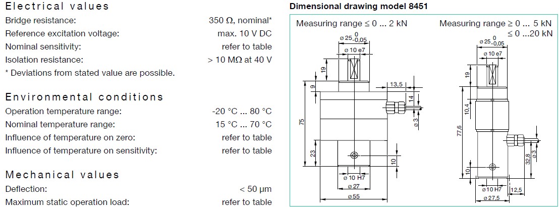 測力8451-6010傳感器測量柱塞和工具的圓形接觸表面之間的壓縮力。在其頂側和空穴在其下表面上的針都只是提供了機械固定和正確地定心的組件。為了提供盡可能大的范圍內的機械相容性越好,銷/孔,可在不同的直徑。連接電纜的設計就像機器人電纜允許頻繁動作,并牢固地固定在稱重傳感器外殼。附件是可用它夾在報刊感應器根據使用的情況下,可以輕松安裝8451-6010:0-10kN傳感器。