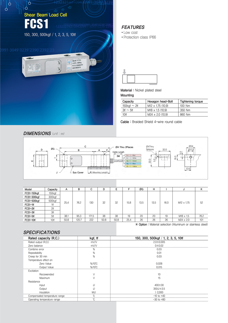 【FCS1-500KG】韓國Fine稱重傳感器fcs1-3t_fcs1-3t傳感器被稱為電子衡器中的心臟部件,科學技術的飛速發展,由稱重傳感器制作的電子衡器也已廣泛地應用到各行各業,實現了對物料的快速、準確的稱量。韓國FIEN稱重傳感器主要應用在各種電子衡器、在線控制、安全過載報警、工業控制領域、材料試驗機等領域。如電子臺秤、電子叉車、電子吊鉤秤、電子計價秤、電子鋼材秤、電子軌道衡、電子汽車衡、動態軸重秤、料斗秤、配料秤、罐裝秤等。