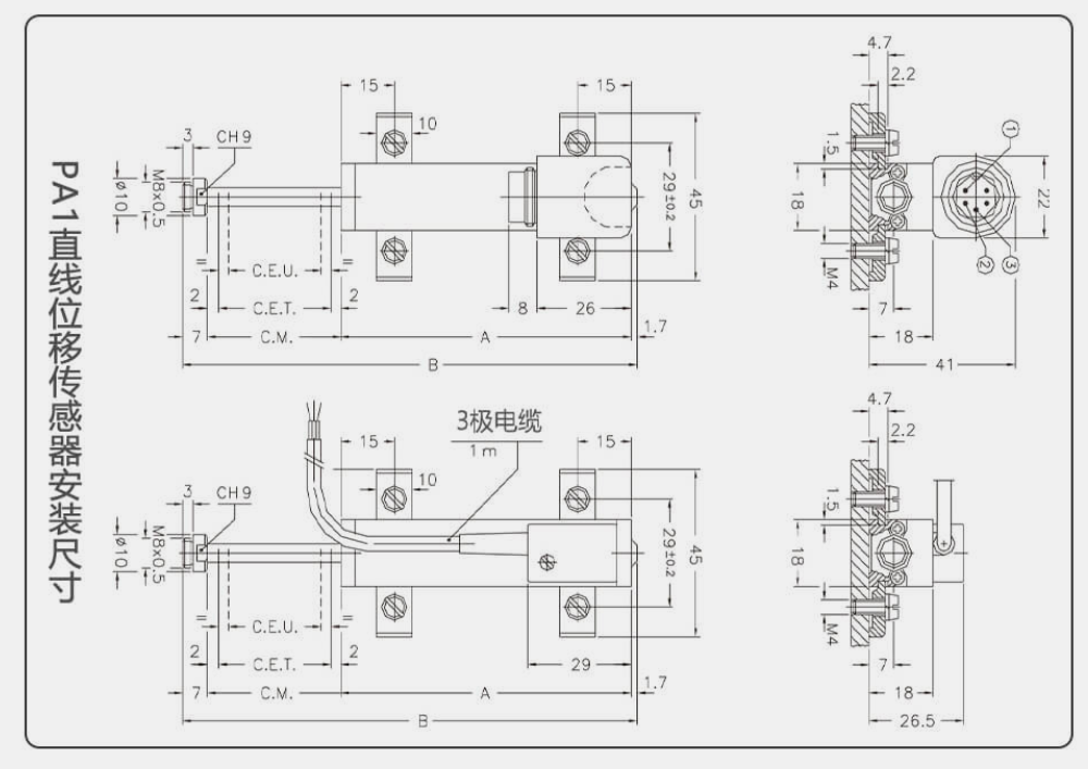 hVc廣州南創電子科技有限公司杰佛倫gefran電子尺PA1-F-025-S01M-XL0202 PA1-F-100-S01M-XL0113尺寸圖:hVc廣州南創電子科技有限公司