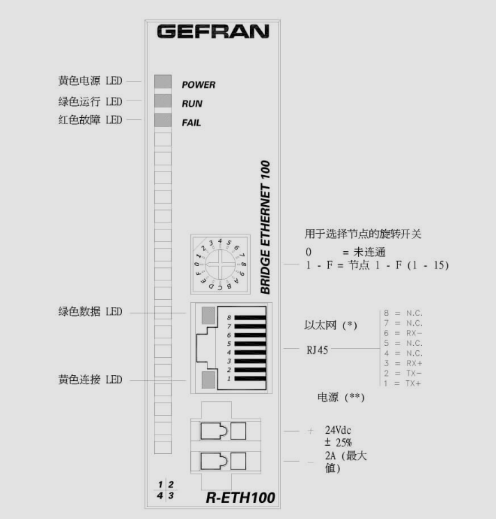 意大利杰佛倫gefranR-EU16 8路數字輸入/輸出模塊內嵌微處理器,微處理器實現與火災報警控制器通訊、電源總線掉電檢測、輸入輸出線路故障檢測、輸出控制、輸入信號邏輯狀態判斷、狀態指示燈控制。模塊接收到火災報警控制器的啟動命令后,吸合繼電器,現場音箱從正常廣播切換到消防廣播,并點亮指示燈,同時將回答信號信息傳到火災報警控制器,表明切換成功。(1)杰佛倫gefranR-TC8溫控模塊工作電壓:總線電壓:總線24V電源電壓:DC24V(2)杰佛倫gefranR-EU16 8路數字輸入/輸出模塊監視電流:總線電流≤1mA電源電流≤6mA(3)R-TC8溫控模塊動作電流:總線電流≤4mA電源電流≤35mA(4)線制:與控制器采用無極性信號二總線連接,與DC24V電源采用無極性電源二總線連接(5)輸出容量:DC24V/1A(兩組輸出最大容量之和為DC24V/1A)(6)R-TC8溫控模塊杰佛倫輸出控制方式:脈沖、電平(繼電器常開/常閉無源觸點輸出,脈沖啟動時繼電器吸合時間為10s)(7)R-EU16 8路數字輸入/輸出模塊gefran杰佛倫出廠設置:兩路常開檢線方式(8)用環境pYJ廣州南創電子科技有限公司
