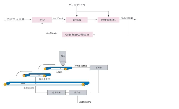 自動配料控制系統(tǒng)在運(yùn)行使用時(shí)物料到配料皮帶秤,配料皮帶秤的重量信號和速度信號進(jìn)入控制儀表,并在儀表內(nèi)部進(jìn)行處理和顯示,同時(shí),輸出與流量成正比的4~20mA電流信號到智能調(diào)節(jié)器,調(diào)節(jié)器根據(jù)用戶設(shè)定的PID參數(shù)及理想控制值,輸出4~20mA電流到電機(jī)控制器,并由其調(diào)節(jié)給料機(jī)速度快慢,從而控制給料量。