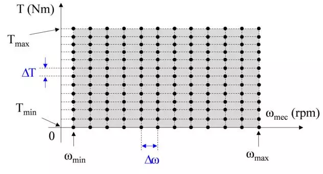 速度范圍 (ωmax-ωmin) 被分成多個等間距 Δω,合理的數(shù)量為 10 到 20。每個速度,扭矩變化也同樣按合理的點(diǎn)10到20,分成步進(jìn) ΔT 。結(jié)果就獲得了 扭矩-轉(zhuǎn)速 網(wǎng)格圖,包含 N = n x m 個點(diǎn)。