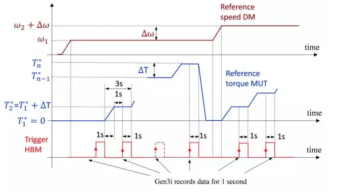 如圖所示,一個操作點(diǎn)持續(xù)了3秒。電機(jī)控制器產(chǎn)生了一個 TTL 信號給 HBM 數(shù)據(jù)記錄儀,當(dāng)上升沿觸發(fā)被檢測到,數(shù)據(jù)記錄儀存儲了一秒的數(shù)據(jù)。按照所選操作點(diǎn)的數(shù)量,完整的過程持續(xù)了10到20分鐘。