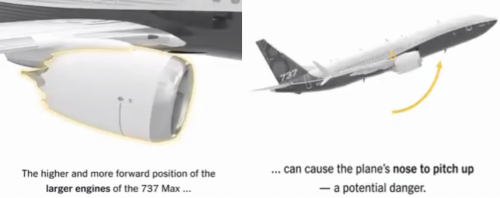 他指出,波音737Max為了省油,升級了更大的新發(fā)動機,但由于起落架太短,只能把發(fā)動機在機翼的位置往前、往上移,但這會造成更大的抬頭力矩而使得飛機容易失速。