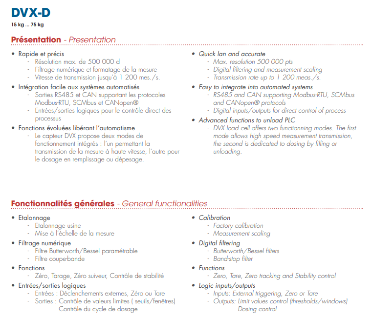 1. 法國(guó)Scaime DVX-D-7.5KG數(shù)字稱重傳感器具有A/D轉(zhuǎn)換功能可將測(cè)量信號(hào)轉(zhuǎn)化成為數(shù)字信號(hào)輸出,數(shù)字信號(hào)的傳播距離更長(zhǎng)、傳輸速度更快、十分適合各種稱重系統(tǒng)使用。SWN廣州南創(chuàng)電子科技有限公司
