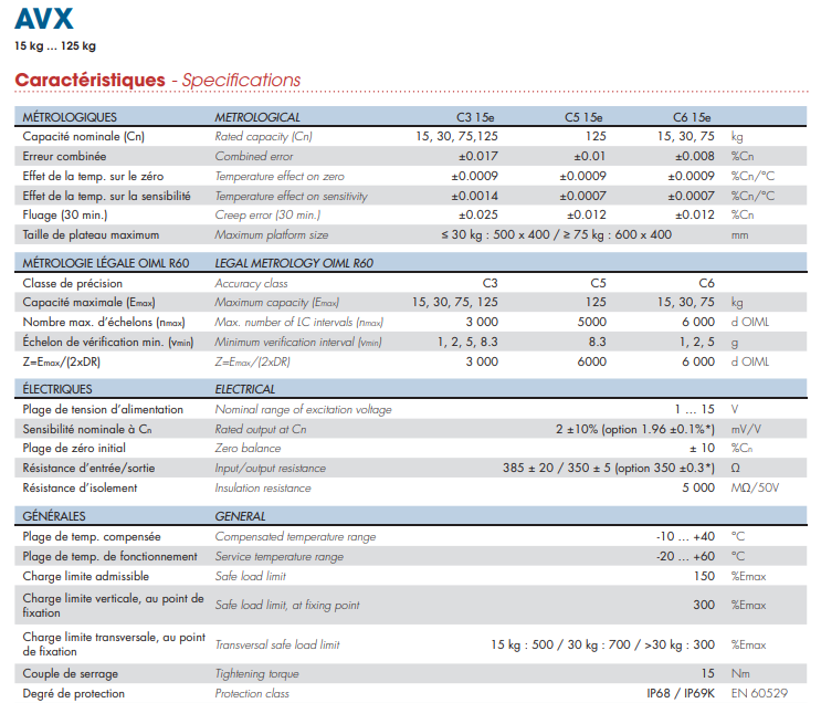 法國世感Scaime稱重傳感器AVX-15KG產品參數圖:VKF廣州南創電子科技有限公司