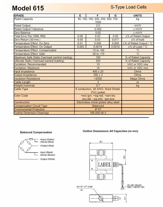 615-1000kg,tedea 615-1000kg稱重傳感器,美國特迪亞應(yīng)用與技術(shù)參數(shù):615系列是一種合金鋼鍍鎳(615)或不銹鋼(616);防護(hù)等級IP67;拉壓雙向使用導(dǎo)線為6線制;可選特:防爆認(rèn)證等級EEX ia IIC T4。適用于料斗稱重、筒槽稱重、配料秤、皮帶秤、機(jī)械秤改造(機(jī)改電)、材料試驗(yàn)機(jī)、振動(dòng)給料裝置、測力計(jì)等。