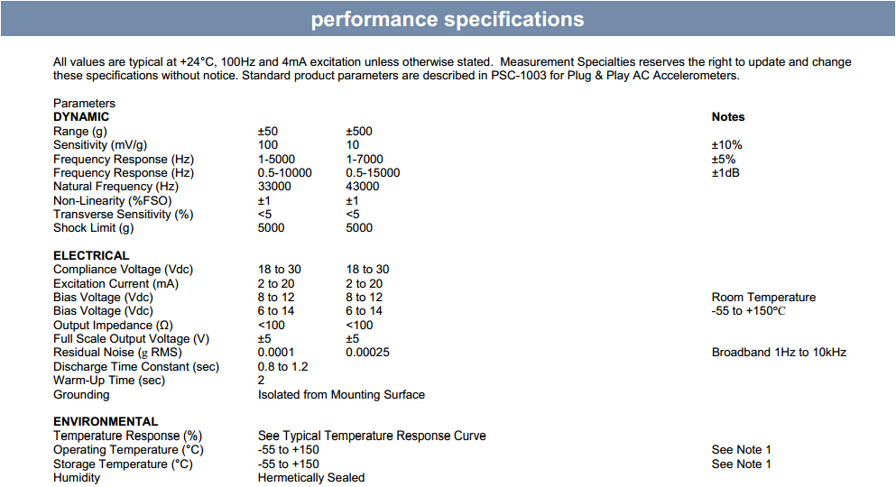 美國(guó)MEAS 7100A系列加速度計(jì)性能規(guī)格圖: