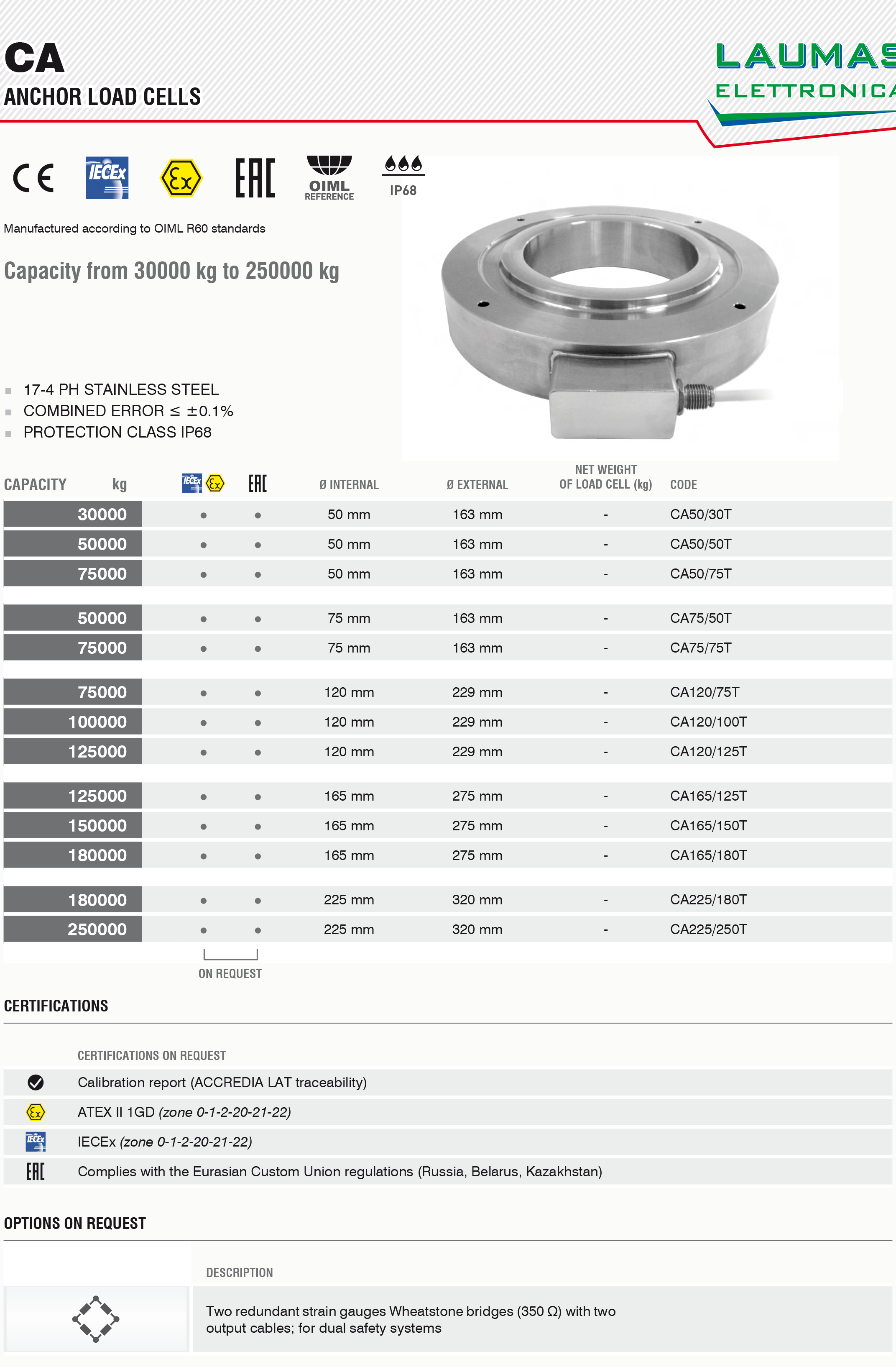 廣州南創(chuàng)專業(yè)供應意大利Laumas CA系列稱重傳感器,【意大利Laumas CA系列】保證貨期快捷,100%原裝正品,10年行業(yè)經(jīng)驗專注高端高質傳感器服務,提供自動化完整解決方案。意大利Laumas FCK系列稱重傳感器相關型號:CA-30000Kg, CA-50000Kg, CA-75000Kg, CA-100000Kg, CA-125000Kg, CA-150000Kg, CA-180000Kg, CA-250000Kg