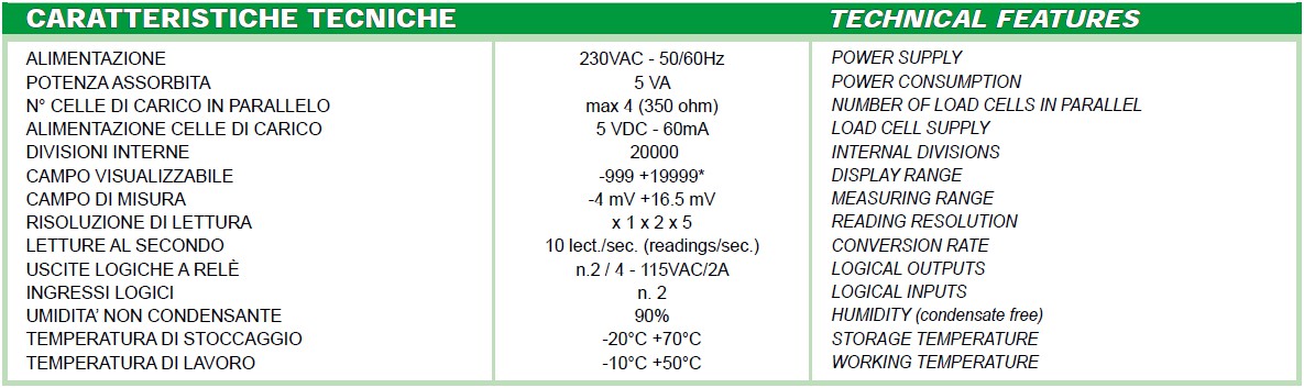 Indicatori di peso in custodia a norme DIN (96 x 96 x 65 mm, foratura 91 x 91 mm) per montaggio a fronte quadro. Grado protezione del frontale IP64. Tastiera a 5 tasti. Punto decimale selezionabile: xxxx; xxx,x; xx,xx; x,xxx. Display semialfanumerico a 4 cifre da 20mm, 7 segmenti..
