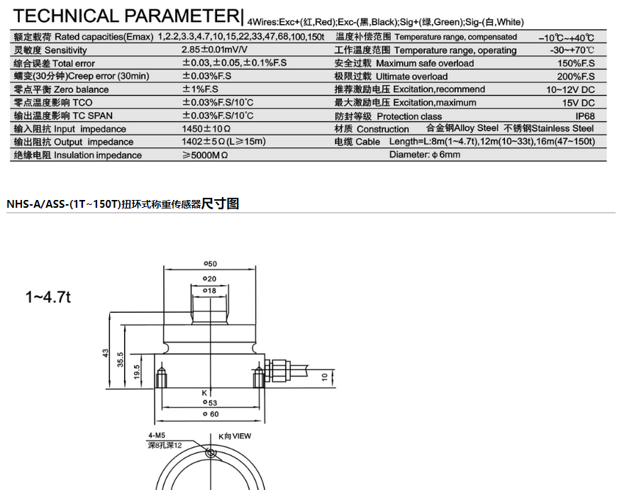 寧波柯力稱重傳感器NHS-ASS-10t產品技術參數及尺寸圖:ZQ7廣州南創電子科技有限公司