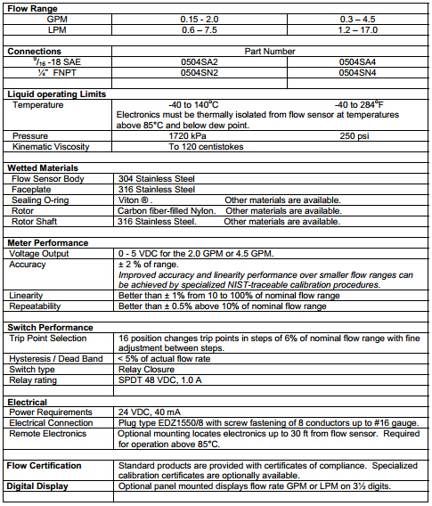 美國Proteus 500系列計量流量開關特性: