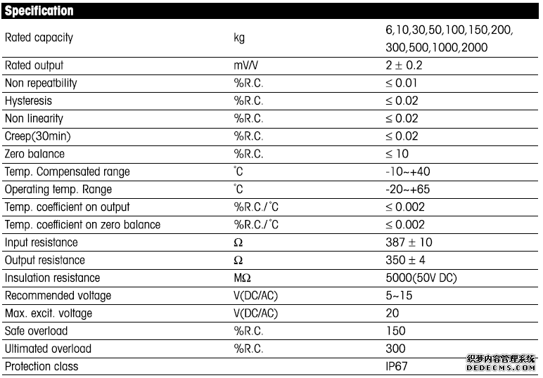 適用于干燥環境中,主要用于臺秤、包裝秤、皮帶秤、檢重秤和過程控制的場合。傳感器容量有6,10,30,50,100,150,200,300,500,1000,2000kg