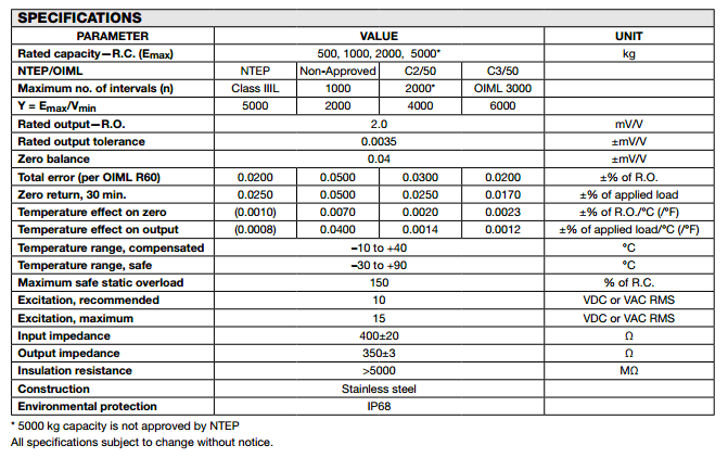 美國特迪亞tedea 620稱重傳感器系列所有量程如下:FlA廣州南創電子科技有限公司