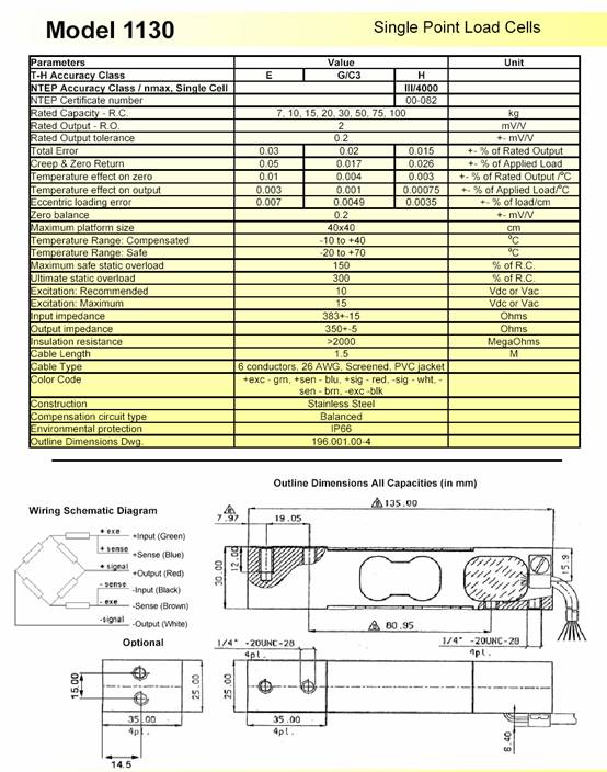 1130-30kg 稱重傳感器tedea 1130-15KG 1130-7KG傳感器技術參數圖: