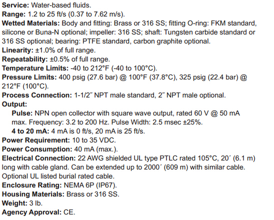 美國DWYER PFT使用感應傳感意義上的葉片葉輪旋轉。傳感器技術不使用磁鐵允低流量監控和沒有問題磁性材料的流動。在擊球時,兩個輸出選擇脈沖或4-20 mA。脈沖模型是一個方波輸出信號與頻率成正比流速度。4 - 20 mA模型有線性的輸出速度4馬相等1.2英尺/秒、20 mA等于25英尺/秒。